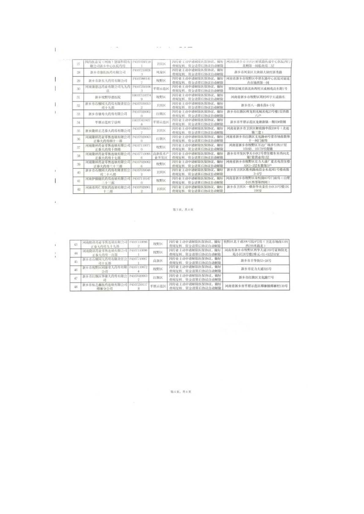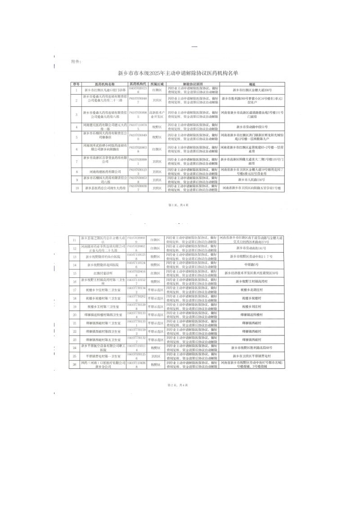 新乡市市本级2025年主动申请解除医保协议医药机构名单的公示